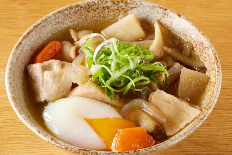 ぷるぷるの温玉と10種類の野菜をたっぷり使った「食べる豚汁」です。