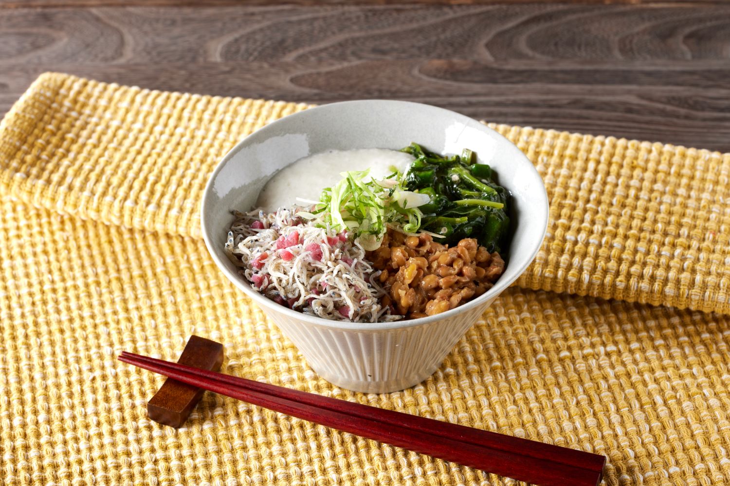 カリっと爽やかな酸味が広がる梅と食物繊維たっぷりの納豆を合わせたヘルシーなねば丼です。