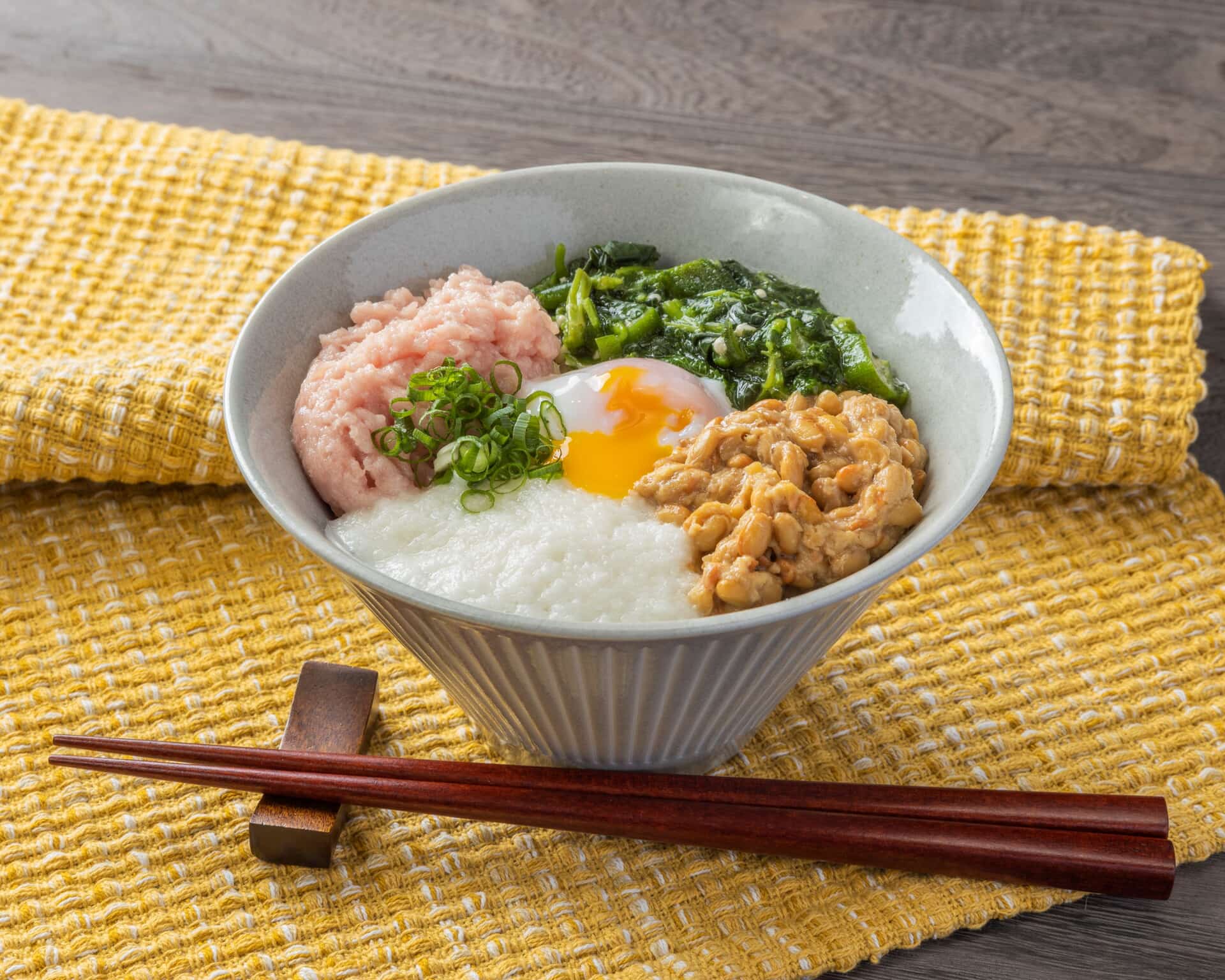 玄米、長芋とろろ、納豆、ねぎとろ、温泉卵、ねばねば野菜(オクラ、モロヘイヤ)、小葱