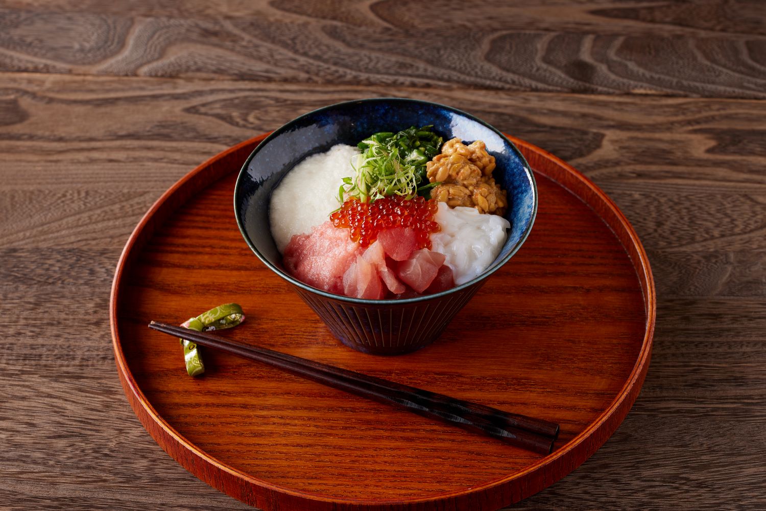 玄米、まぐろ、ネギトロ、イカソーメン、いくら、長芋とろろ、ねばねば野菜、納豆、香味野菜(ワケギ、茗荷、生姜、大葉)
