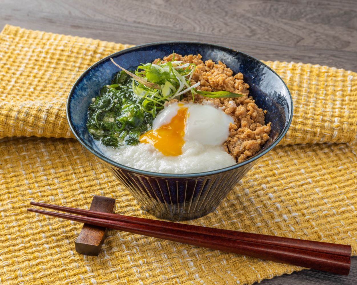 自家製のタレを絡めて丁寧に煮詰め、味を染みこませた鶏そぼろと、ねばねば食材を合わせて。