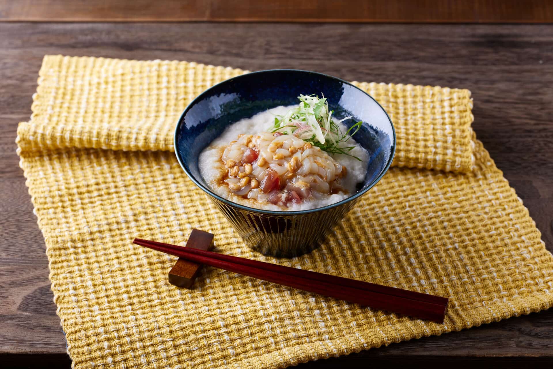 玄米、長芋とろろ、イカ、納豆、マグロ、香味野菜(ワケギ、茗荷、生姜、大葉)、山形のだし(胡瓜、みょうが、ナス、白だし)