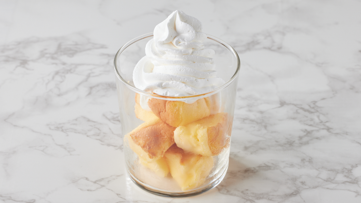 クリームをたっぷり30g乗せた持ち運び可能なカップスフレパンケーキです! デスクワークなどしながら気軽にお召し上がりいただけます!