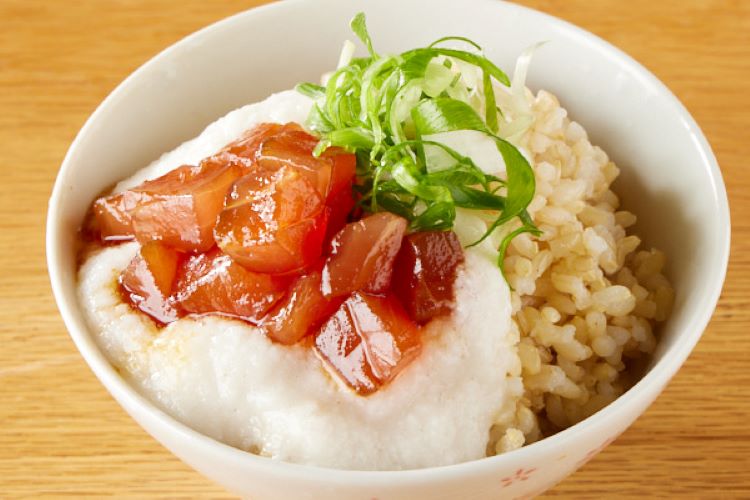 刻んだマグロの切り身とむくみや高血圧予防に効果が期待される長芋とろろを玄米にたっぷり乗せました。とろろの効果で消化を手助けしてくれます。