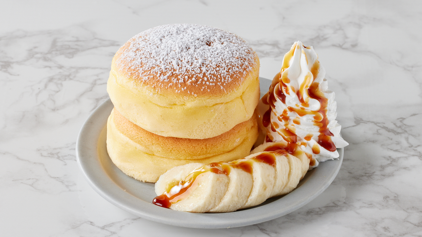 スフレパンケーキ(直径約8cm)2個.ホイップクリーム20g.バナナ30g.キャラメルソース10g
