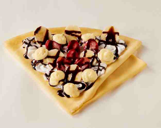 濃厚チョコレートに加え、バナナと苺をふんだんに使用!カスタードとクリームを両方楽しめるWバナナいちごクリームクレープです! ※クレープのサイズをお選びいただけます。