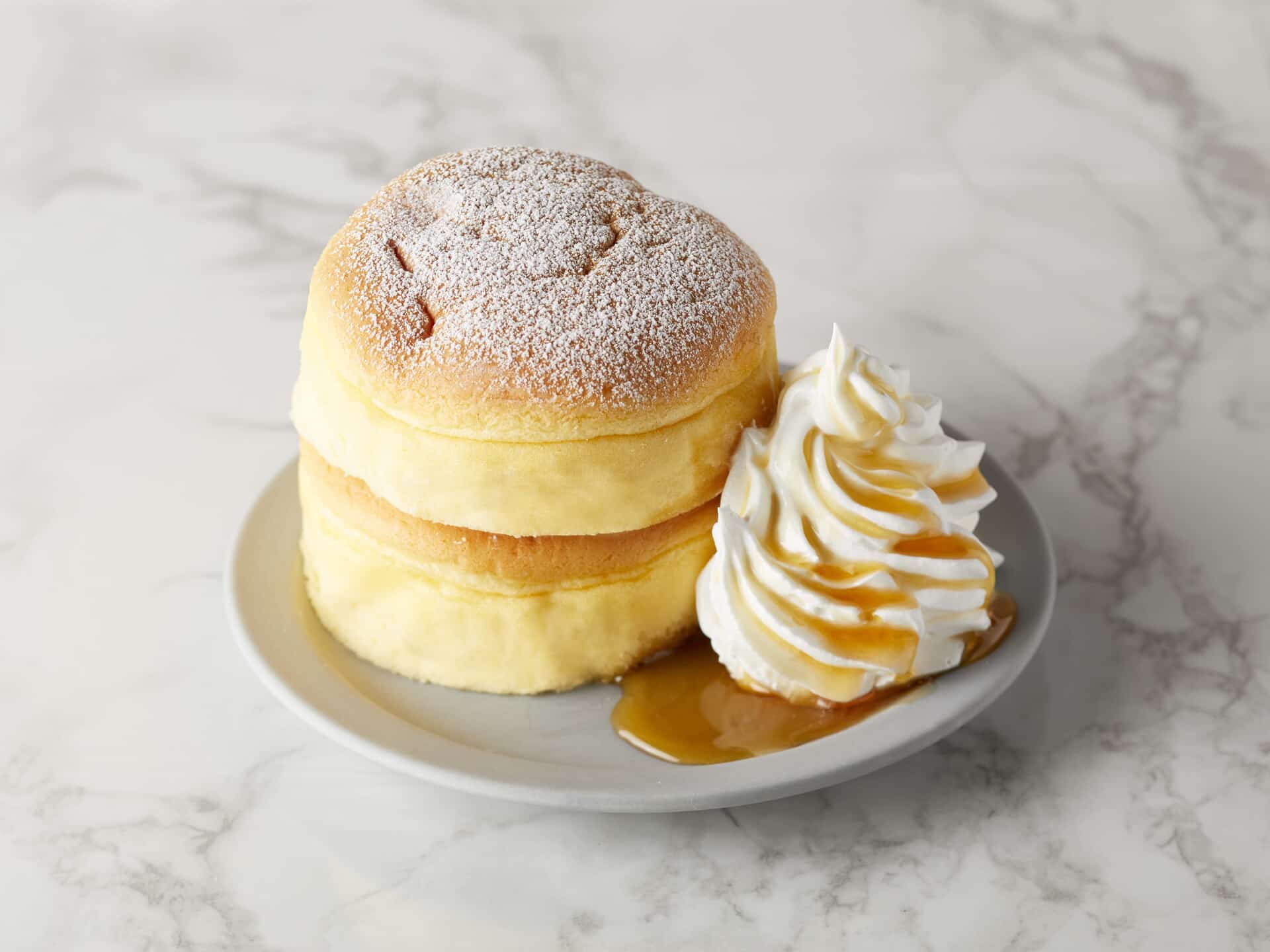 スフレパンケーキ(直径約8cm)2個.ホイップクリーム20g.メープルシロップ10g