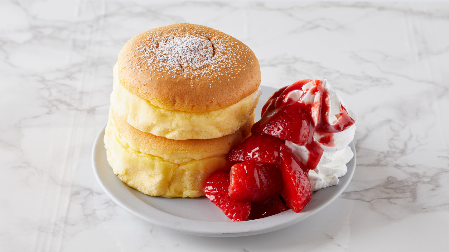 トロトロになるまで煮詰めた真っ赤な魅惑のストロベリーソースと甘酸っぱい苺果肉に、たっぷりのホイップクリームを添えたふわっとしっとりとろけるスフレパンケーキBOXです。
